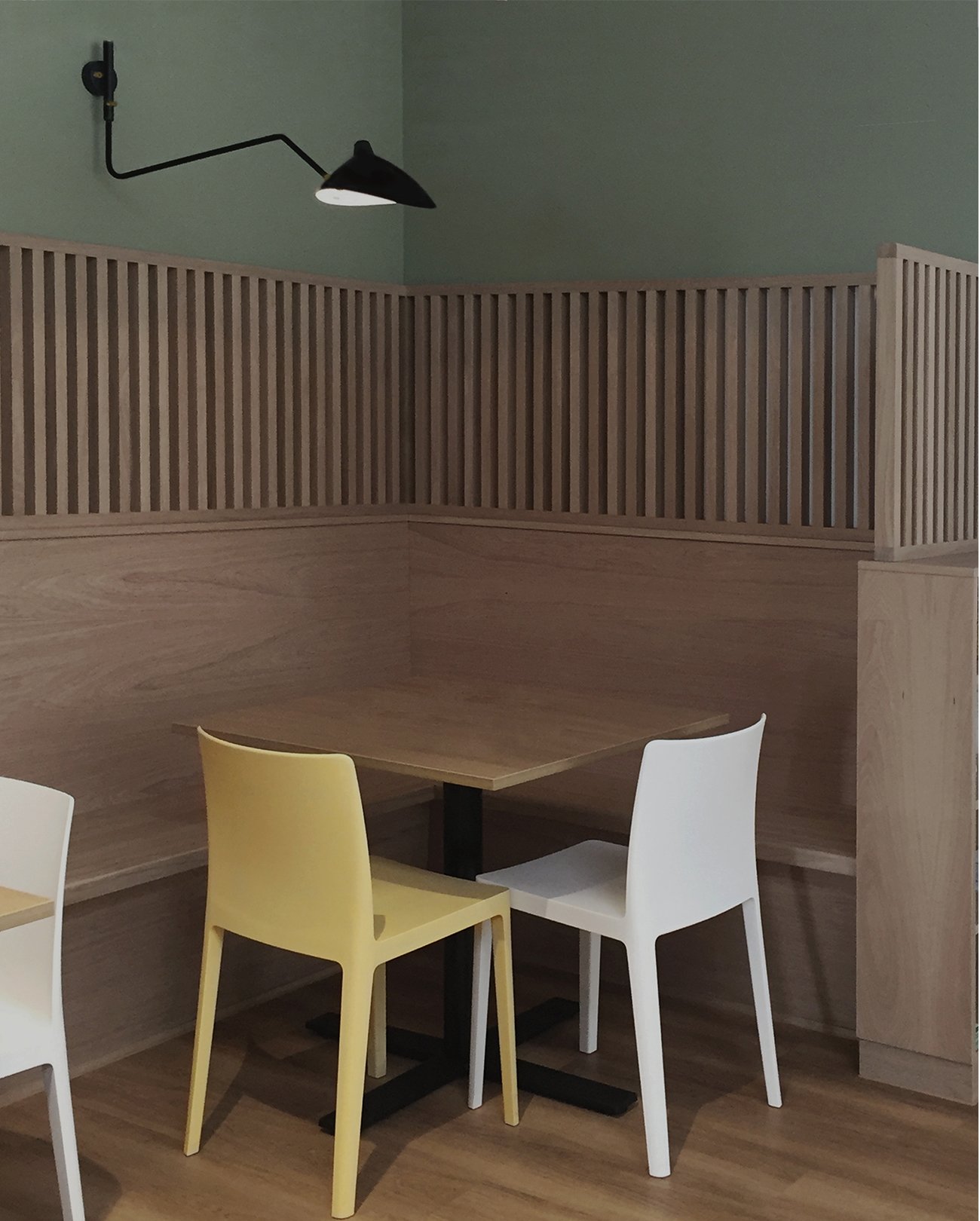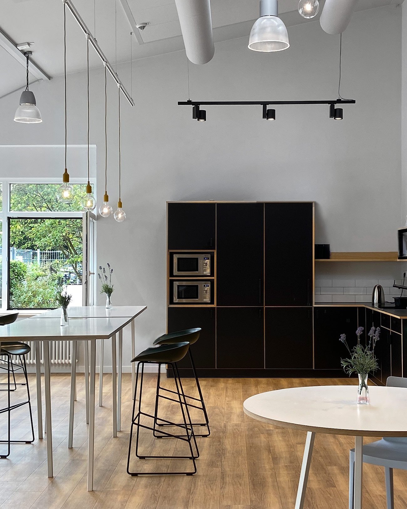 The main area would primarily be used as a restaurant for their employees, but it also needed to be flexible enough for quarterly company-wide events. The use of bespoke, solid oak room dividers helped create smaller rooms within the large space, but were designed to be mobile and allow for larger auditorium style seating.